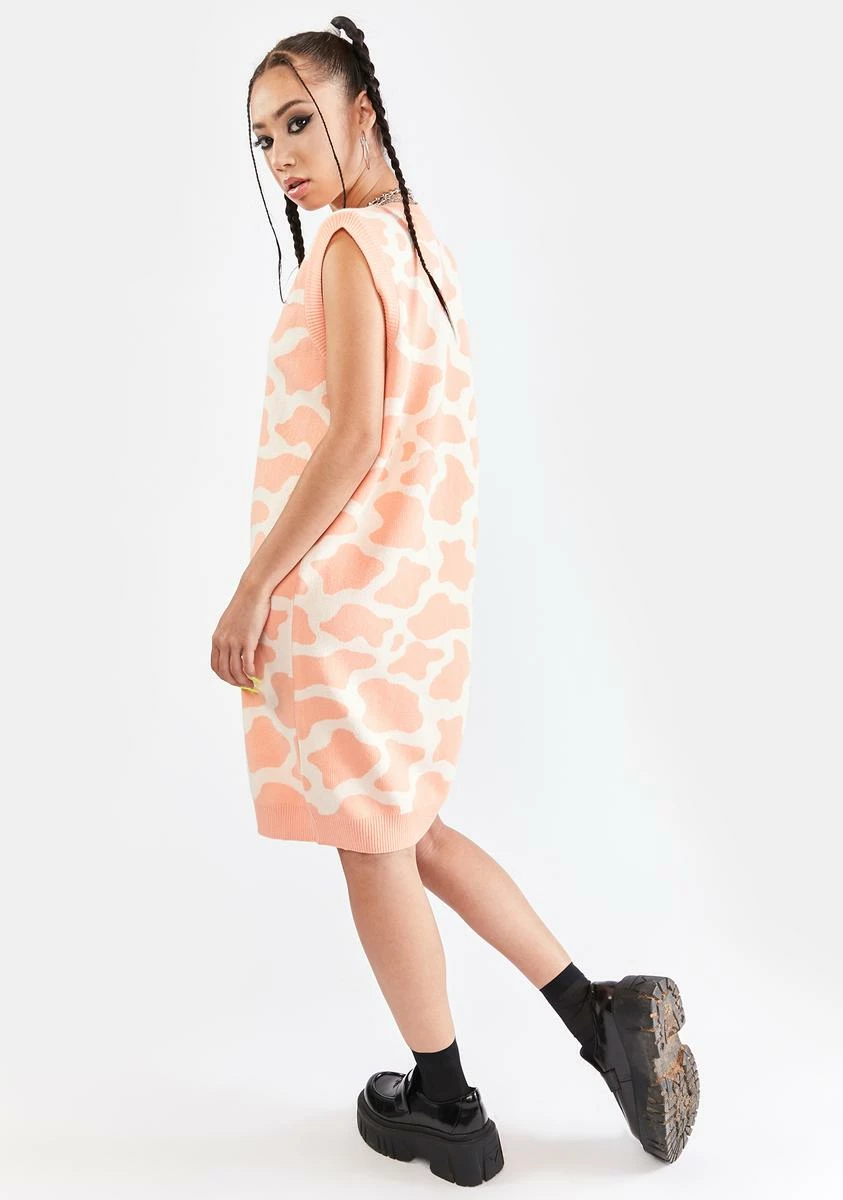has a relaxed fit, ribbed knit trim at the v-neckline, cuffs and hem, and a two tone cow print all over.