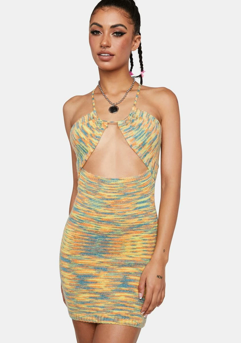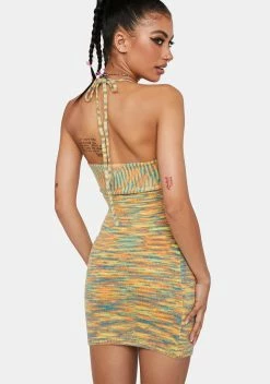 cuz you are in it to win it. This dress has an all over space dye print, a halter neckline, adjustable tie closures, cut out detailing, and a bodycon fit.