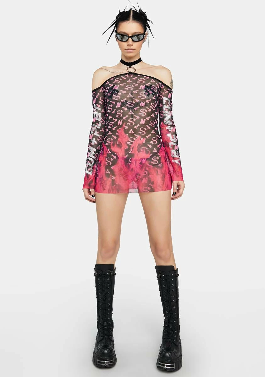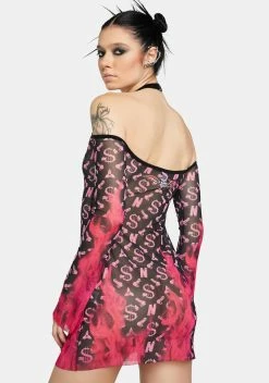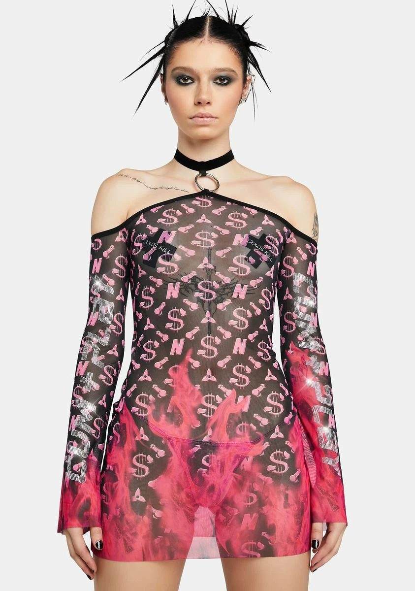 cuz things are about to get frisky! This mesh mini dress has an O-ring velvet choker neckline, an off the shoulder design with long sleeves, dick dollar sign monogram graphics, flame prints on the front and back, and rhinestone “cum & play” motifs on the arms.