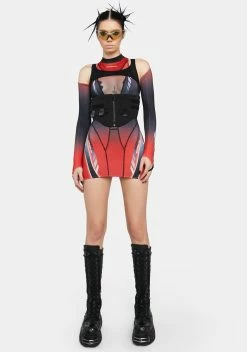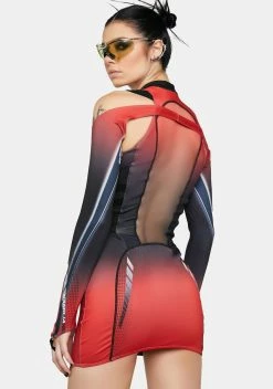 cuz you’re claiming the winning title. This mini bodycon dress has a stretchy mesh construction with racing graphics all over, detachable long sleeves with finger loop details, an attached tactical corset on the front with 3D cargo pockets, and a mock neckline.