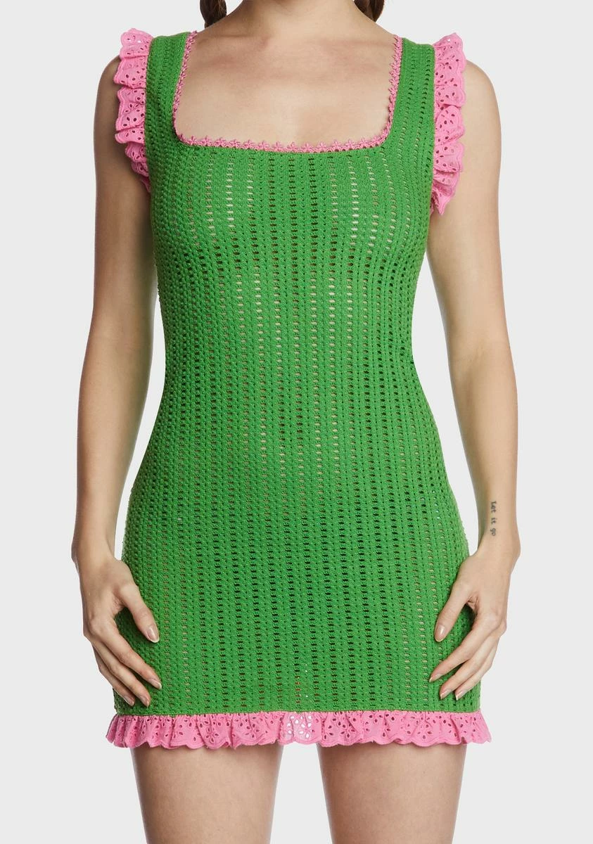 cuz you’re what dreams are made of. This mini dress has a semi-sheer crochet knit construction, ruffled broderie trim, and a bodycon fit.