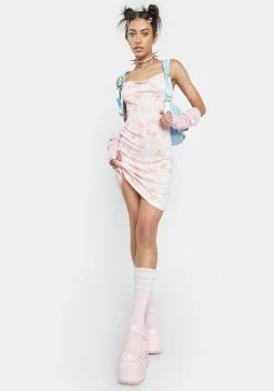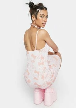 has a knit construction, a cowl neckline, spaghetti straps, and a Hello Kitty bows and hearts graphic print all over.