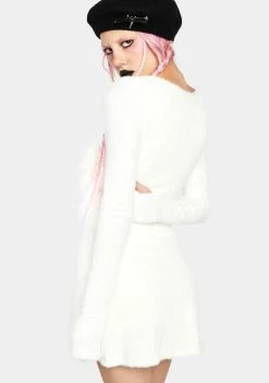 cuz you’re ruff and ready. This mini dress has a soft-touch faux fur construction, a 3D poodle applique at front, jersey lining, and long sleeves with finger holes.