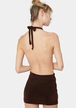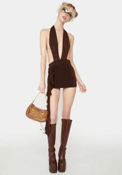 cuz you’re the one they wanna take home, babe. This halter mini dress has a deep plunging neckline, a flirty open back, adjustable tie closures on the neck, and cascading ruffle trim on the front.