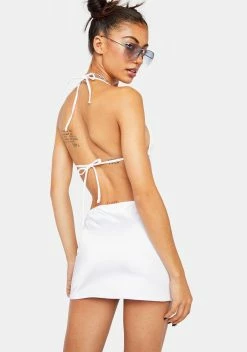 has a satin construction, a plunge bust with an o-ring detail, an open back and side cutouts, and a halter neckline with string ties.