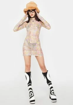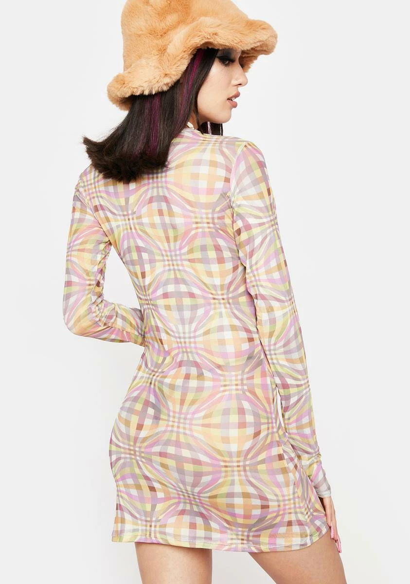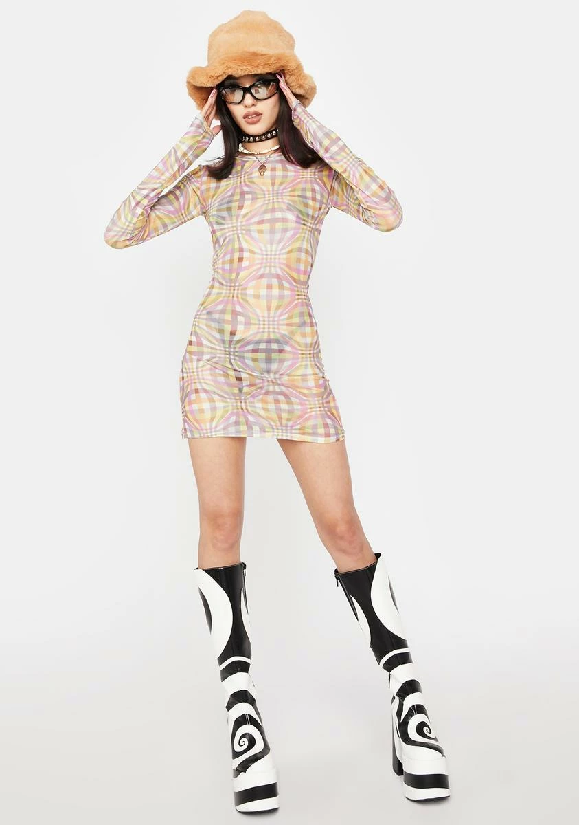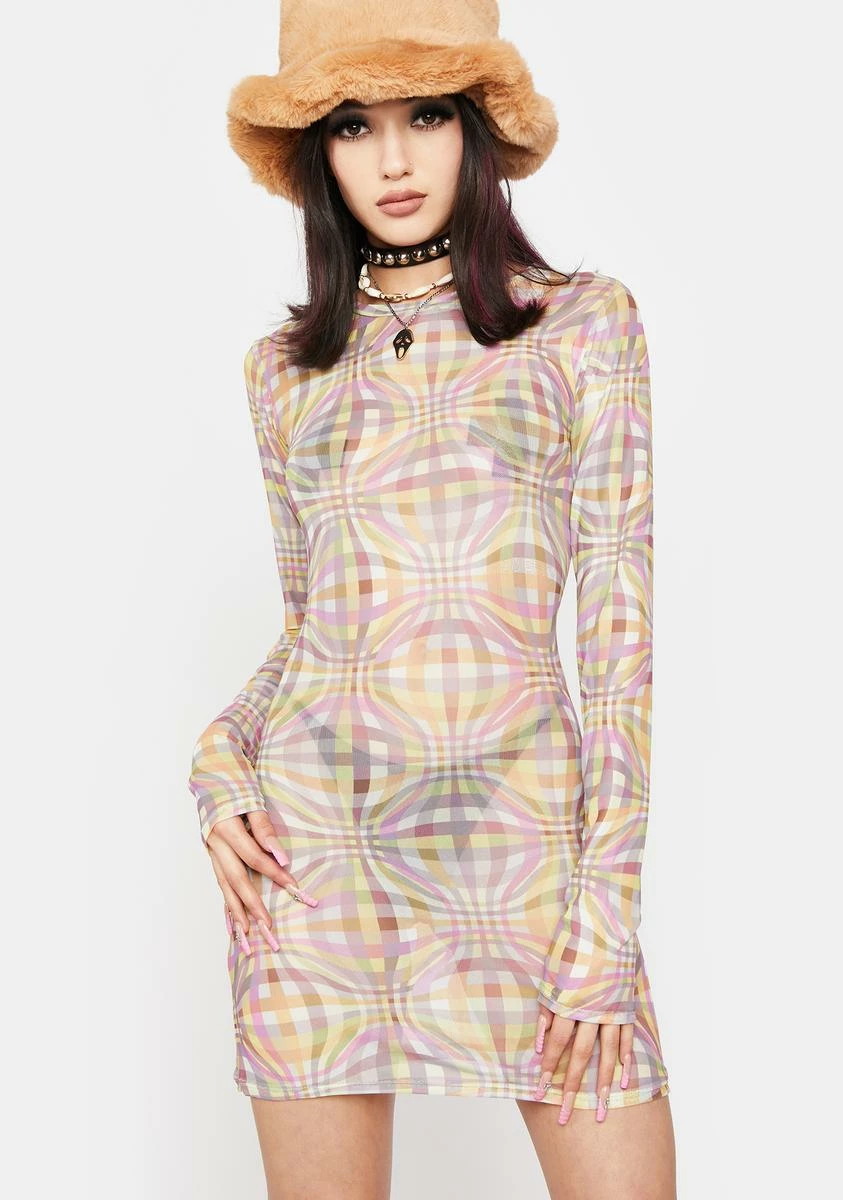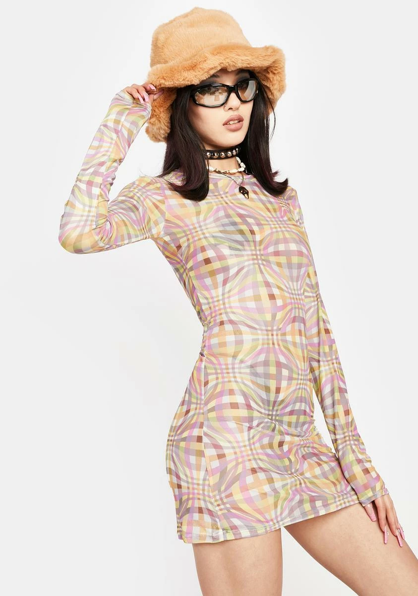 it was all a dream. This mini dress has a sheer mesh construction, a wavy plaid print, long sleeves, and a bodycon silhouette.