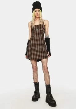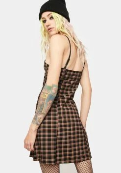 you’re ahead of the game. This slip dress has a plaid print, a sweetheart neckline, vegan leather shoulder straps, a brand logo patch at the bust, and a side zipper closure.