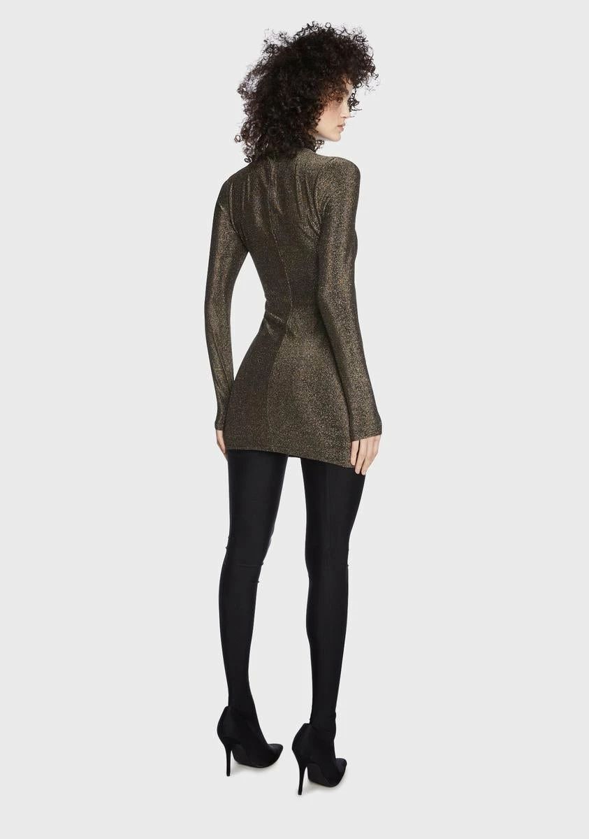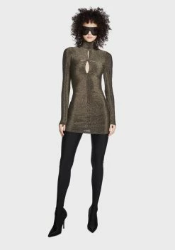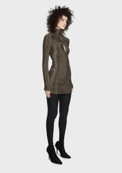let loose. This dress comes in a glitter construction, with a turtleneck, long sleeves, a back zip closure, and keyhole cut out details.