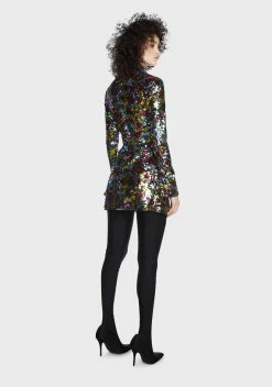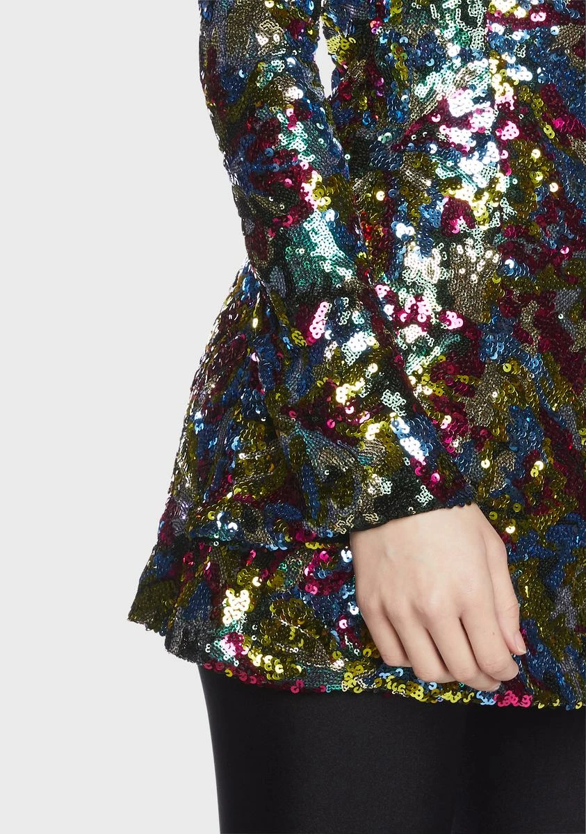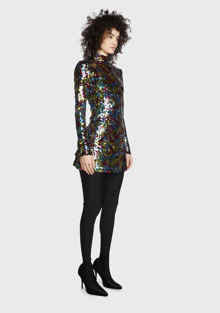 it’s a celebration. This dress comes in a sequin construction, with bell sleeves, a mock neck, and back zip closure.