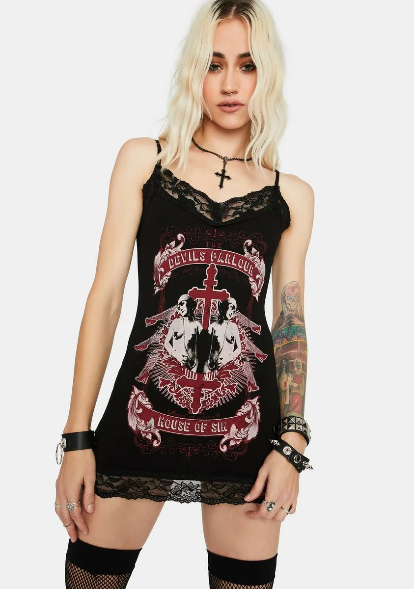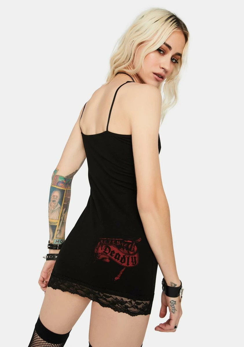 cuz youâre making a home in hell. This cami dress has lace trim, a bodycon fit, and deadly graphics all over.