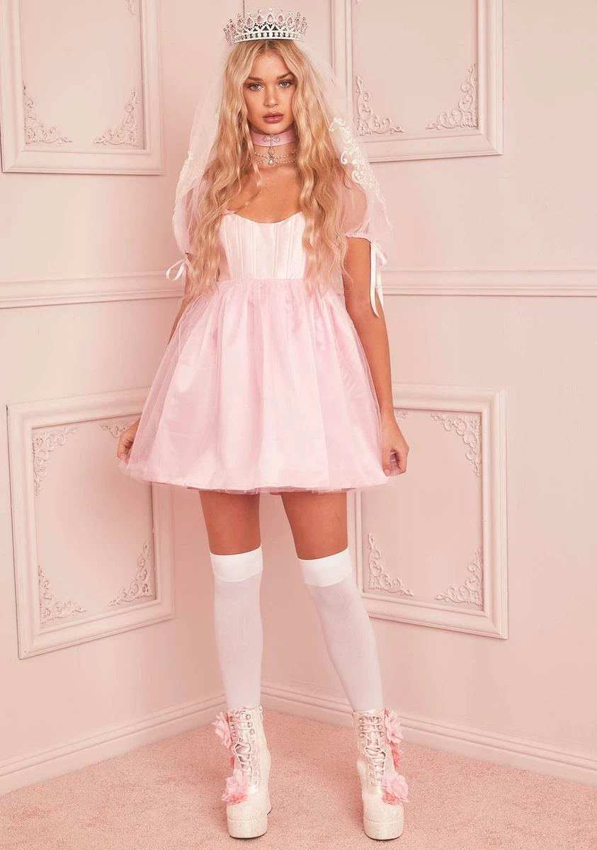 cuz Romeoâs waiting outside. Be swoon worthy in this babydoll corset dress which has sheer puff sleeves with lace up ties, a tulle skirt, and back lace up ribbon closures.
