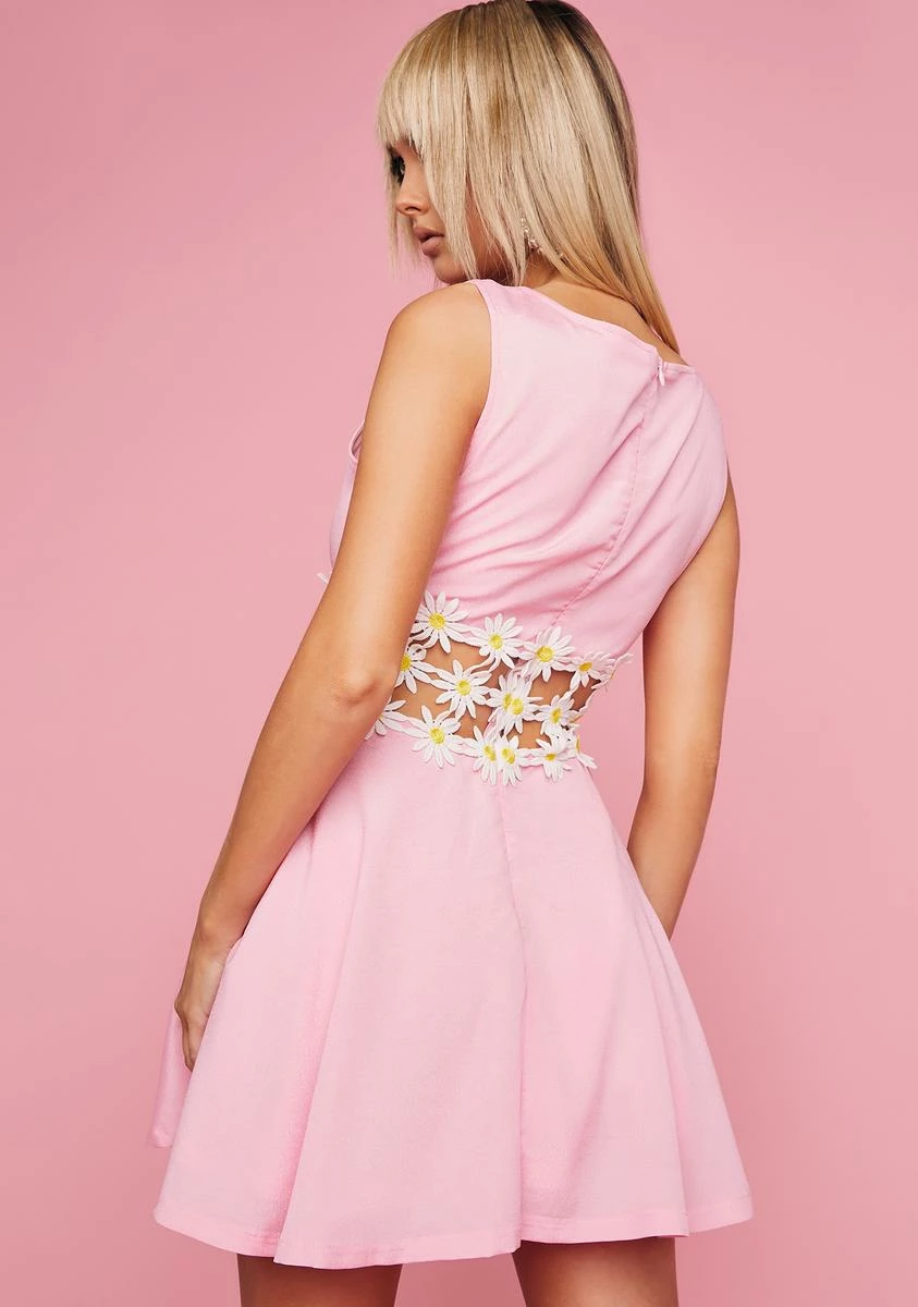 cuz you’re the it girl. This mini dress comes with a round neckline, a cut out waist with embroidered daisies, a back zip closure, and a pleated skirt.