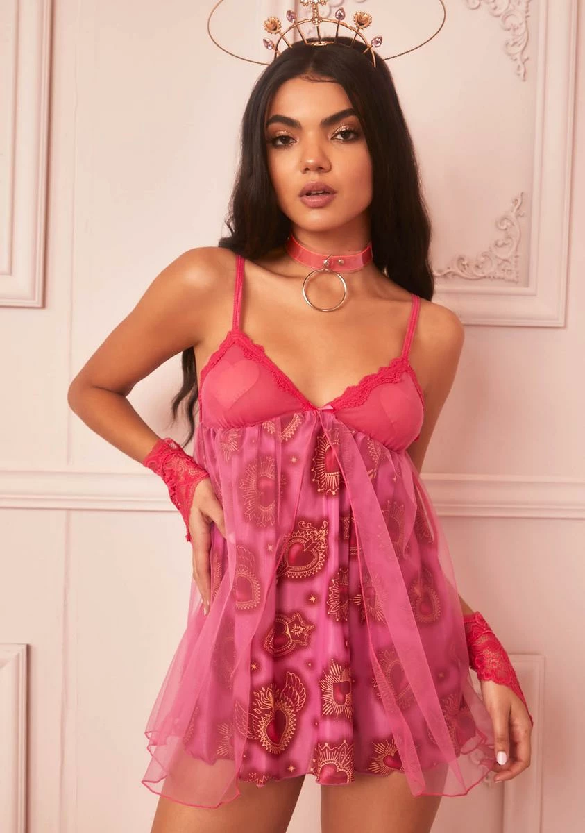 cuz you’re my saving grace. Surround them with your aura in this slip dress which has a sacred heart print all over, a mesh overlay, a sheer bra top with a lace trim, adjustable shoulder straps, and matching panties.