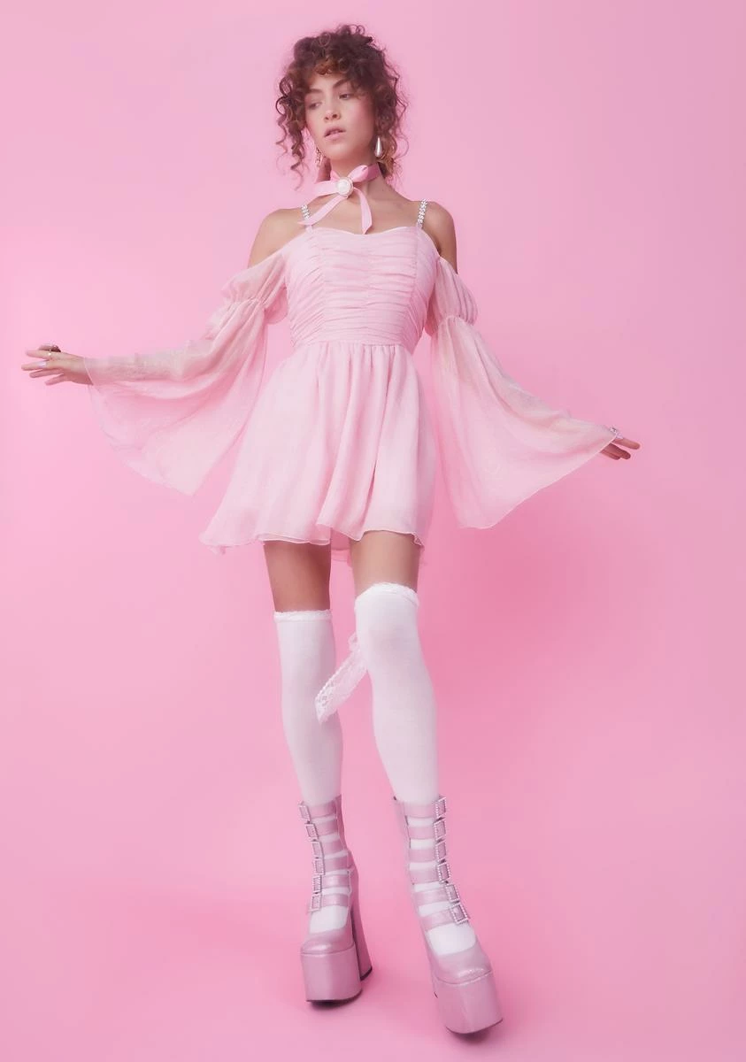 because you’ve got cake on cake on cake. This chiffon corset dress has long puffy bell sleeves, a ruched midsection, and a circle skirt bottom.