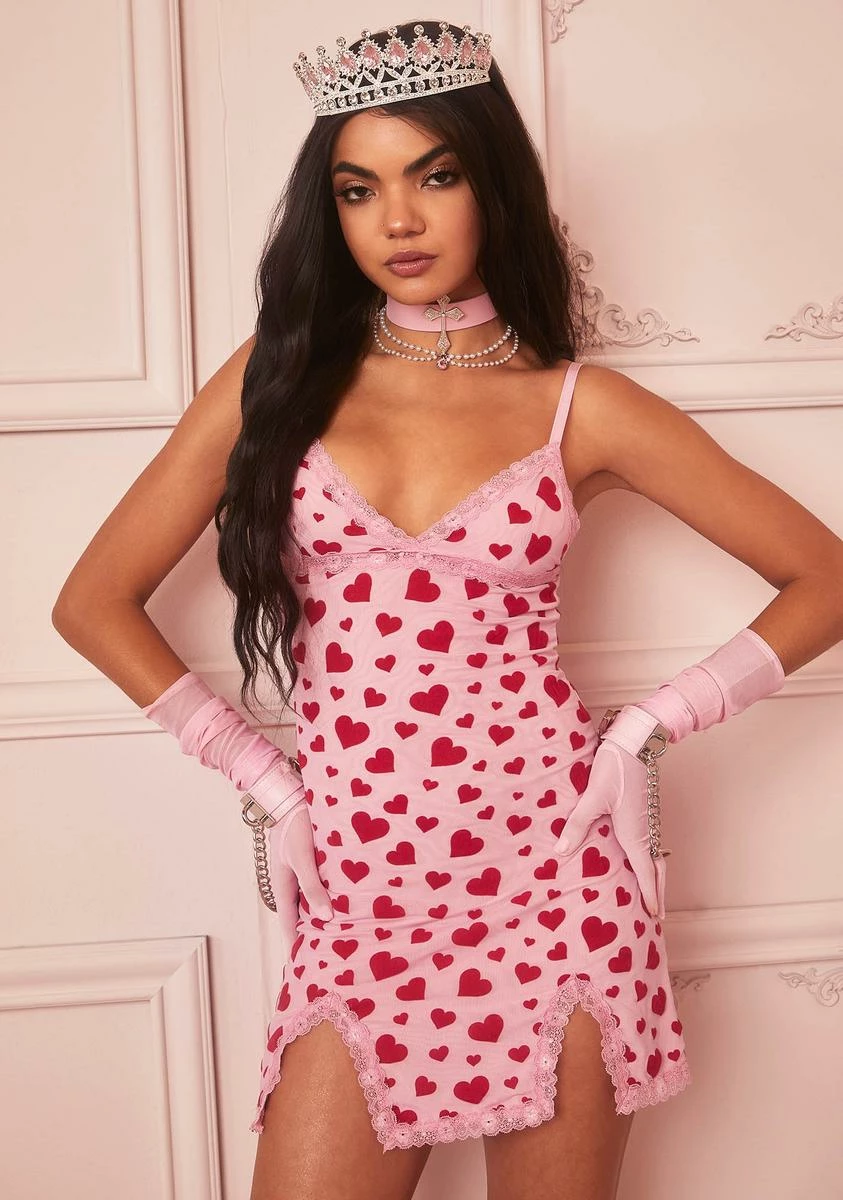 cuz you’ll never give up on love, babe. This mini slip dress has lace trim, double slits on the front, adjustable shoulder straps, and a mini hearts print all over.
