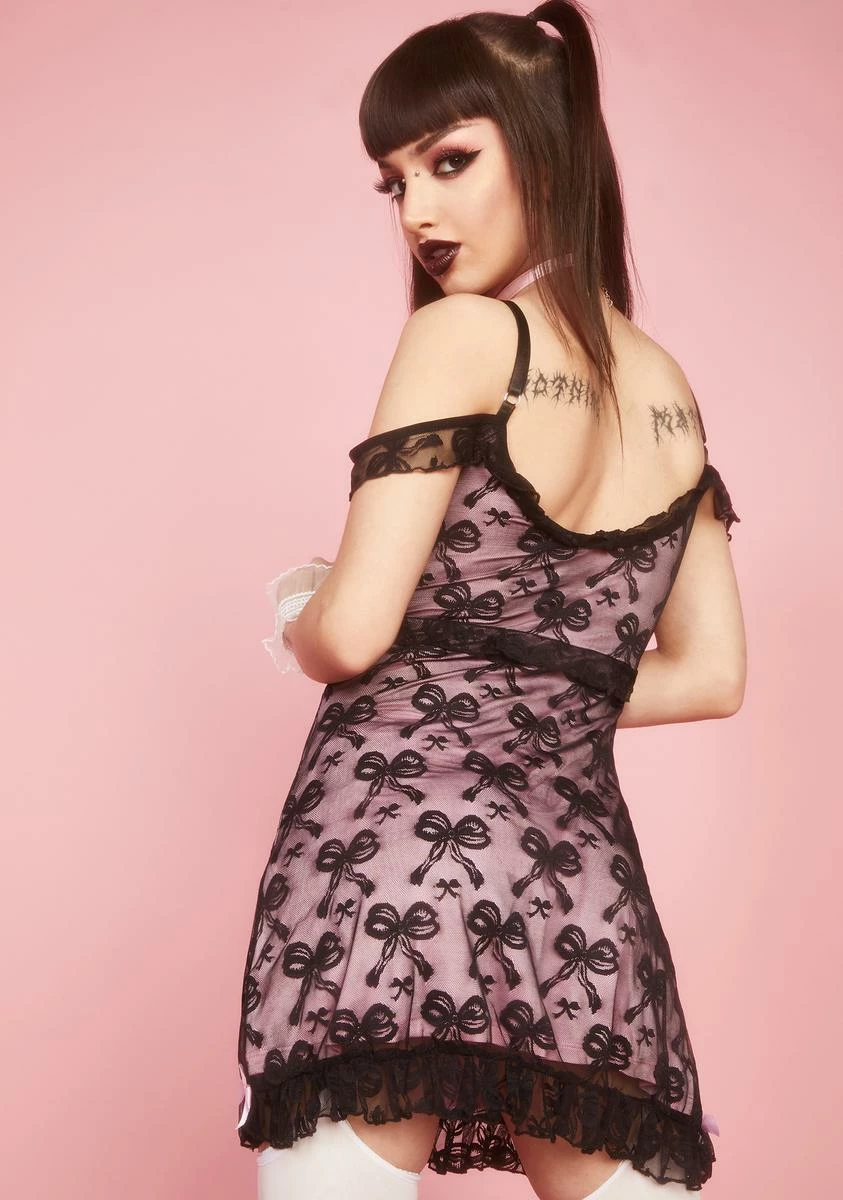 cuz they gotta get all the details, babe! This mini dress has a mesh overlay construction with a bow pattern all over, ruffle trim, satin bow details on the front, adjustable shoulder straps, and a side zip closure.