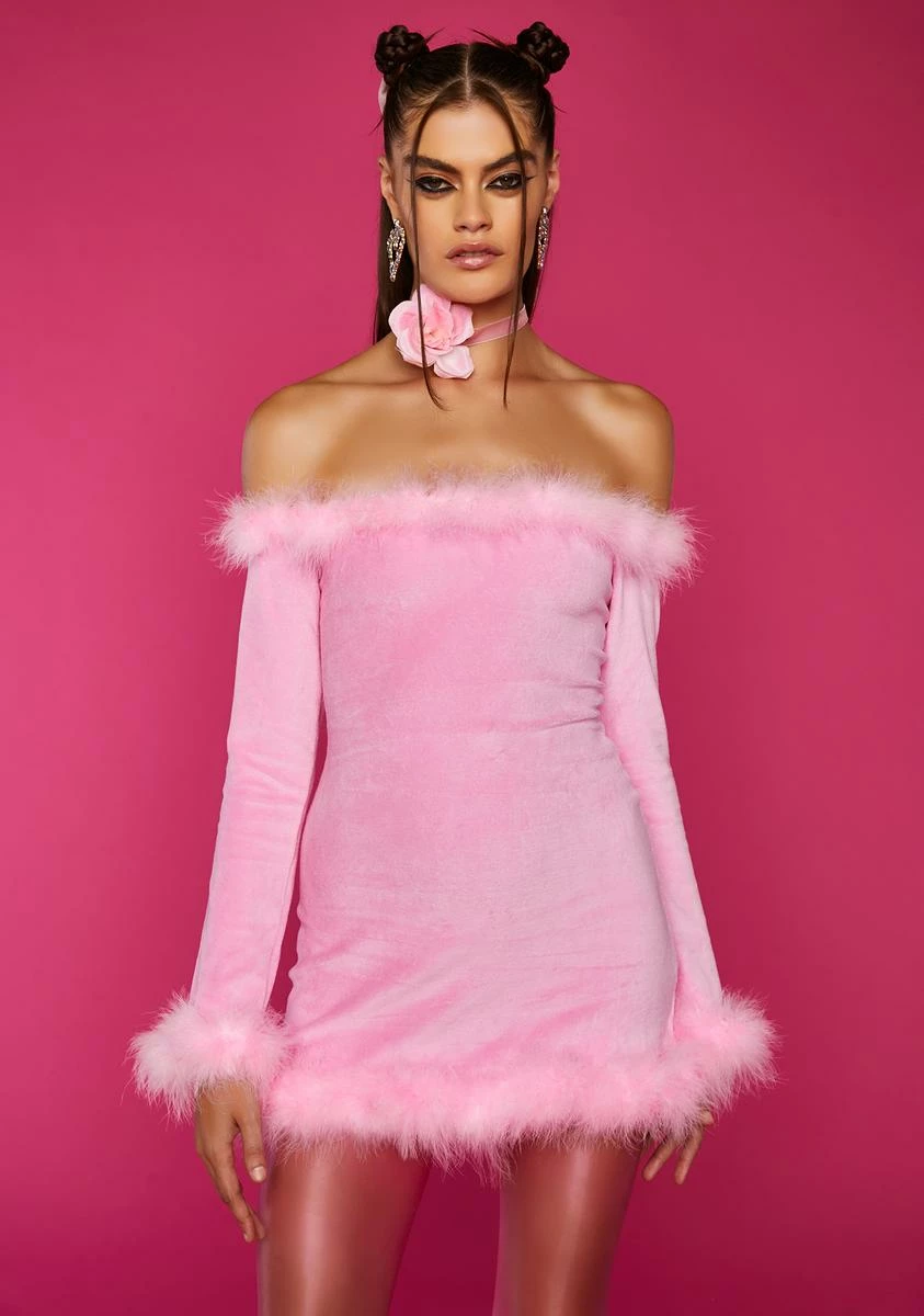 cuz your life is a fairy tale! This off shoulder mini dress has a velour construction, long sleeves, and marabou faux feather trim.