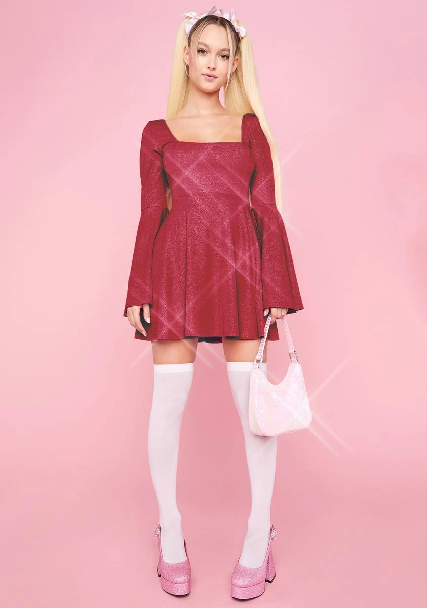 cuz you’re ready for your close up.This babydoll dress has a lurex construction, long bell sleeves, and a square neckline.