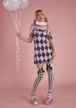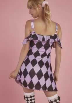 it’ll be a night to remember! This mini dress has a mesh construction with an argyle print, satin shoulder straps with bow details, ruffle trim along the neckline and off the shoulder sleeves, and lettuce edge trim along the hem.