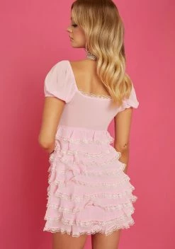 can you keep up? You’ve got ’em hooked in this babydoll dress that has a square neckline with a decorative satin bow, puff sleeves, ruching accents at the bust, and a layered ruffle skirt with contrast lace trim.
