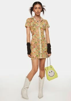 the vibes are not it today. This button up shirt dress has a mesh construction, short sleeves, a collar neckline, and a retro square pattern all over.