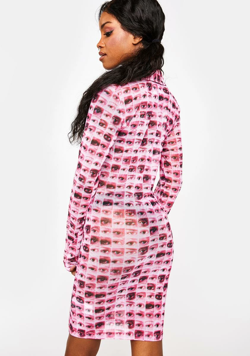 you’re the center of attention. This mini dress has a sheer mesh construction with an eye print, a collared neckline, ruching details, and front button down closures.