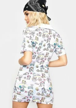 has an all over sublimated Tokidoki character graphic print, short sleeves, a collared neckline, short sleeves, and a bodycon fit.