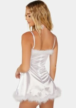 cuz you’re the voice of reason. This dress comes in a satin construction, with marabou fur trim details, adjustable spaghetti straps, and a back zip closure.