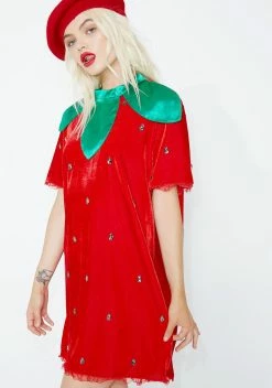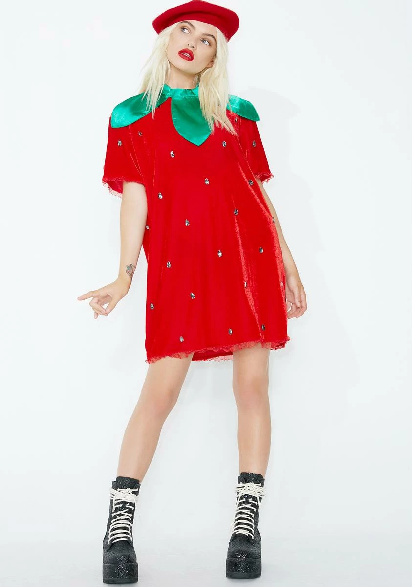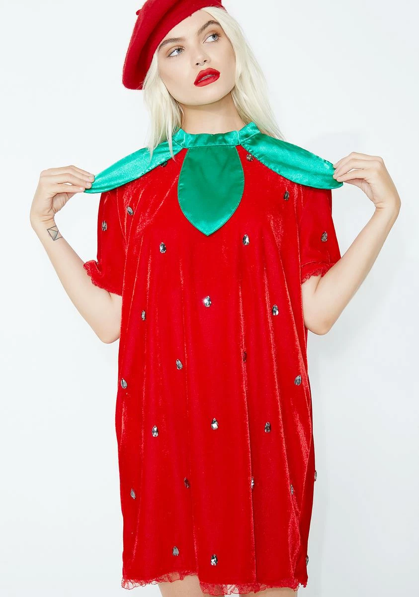will make ya too sweet to resist. This juicy af costume has a boxy red dress with lil embellishments all over and a leafy green neckline. Complete your look with a red beret N’ boots so you can look like a snack!