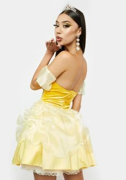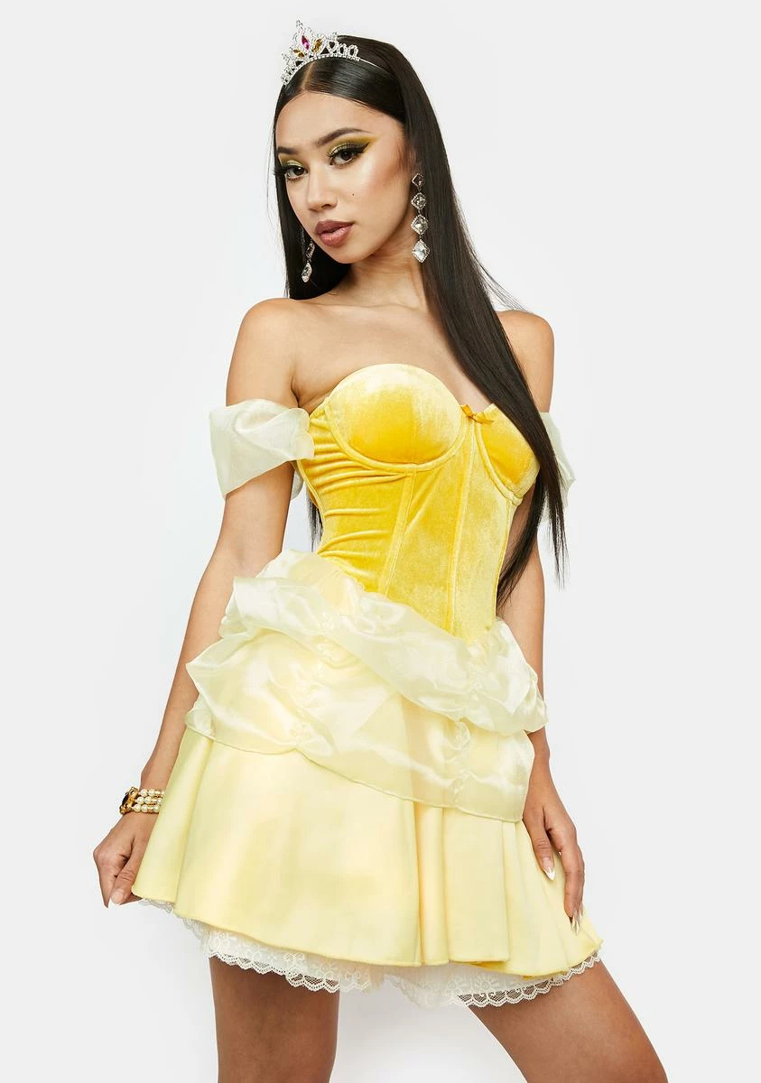 they’ll recognize your royalty! This princess costume dress has a velvet bodice with a sweetheart neckline, off-the-shoulder sleeves, organza ruffles, a satin skirt, and comes with a matching tiara.