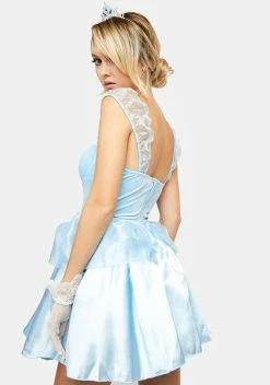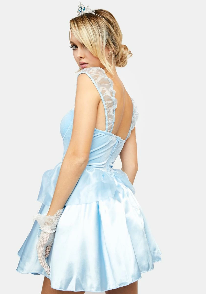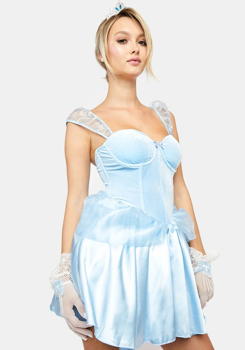 if the shoe fits! This princess costume includes a mini dress that has a velvet bodice with a sweetheart neckline, sheer lace cap sleeves, organza puff details on the waist, a satin skirt, and a tiara.