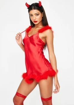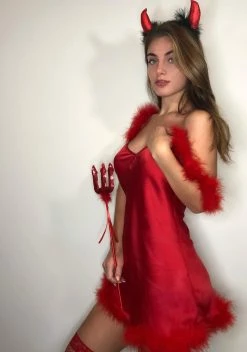 got ya up close N’ personal with evil. Submit to Satan in this hellishly hottt mini dress costume set that has flirty faux fur trim, adjustable straps and comes with a fiery pitchfork, fishnet thigh-highs and a horny headband.p