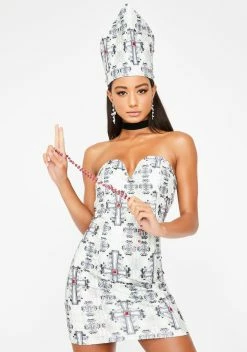 will have ya prayin’ to the high fashion gods! You follow ‘The Nu Rihligion’ in this gala ready costume set that comes with a bodycon mini dress, a matching headpiece, and a red beaded cross necklace.