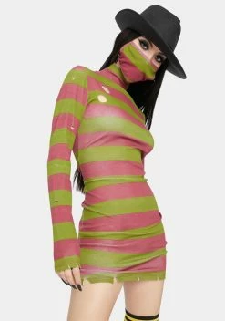 cuz even your dreams aren’t safe. This killer costume set includes a long sleeve turtleneck dress with distressed detailing, a matching face mask, and a fedora hat.