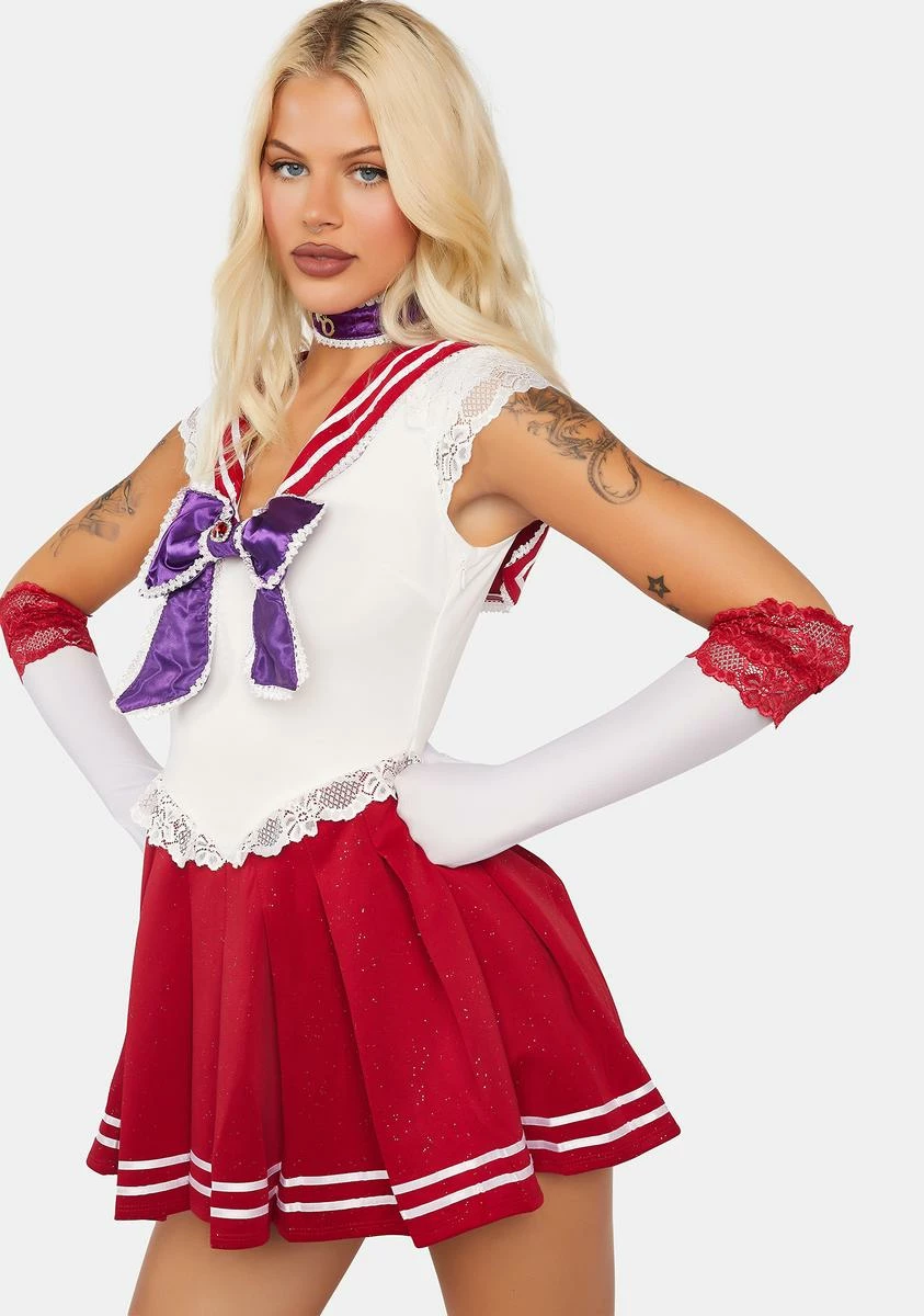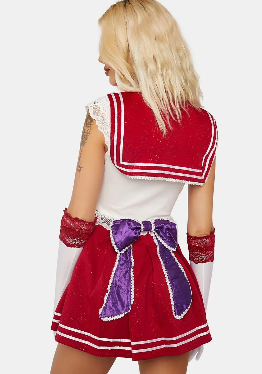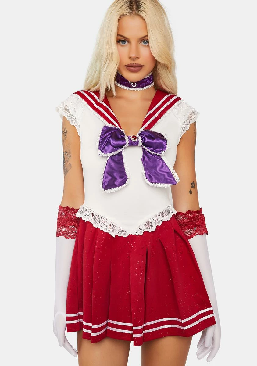 DAMAGED – This product has color transfer damages and is final sale. Color transfer may vary in area. This costume set includes a mini dress with a contrast striped sailor collar and skirt, a bodice with lace trim, satin bow details, and a matching choker and gloves. **FINAL SALE**