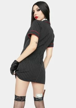 cuz you throw down whether you win or lose. This mobster costume set comes with a double breasted pinstripe blazer dress, fingerless gloves and a tie collar.