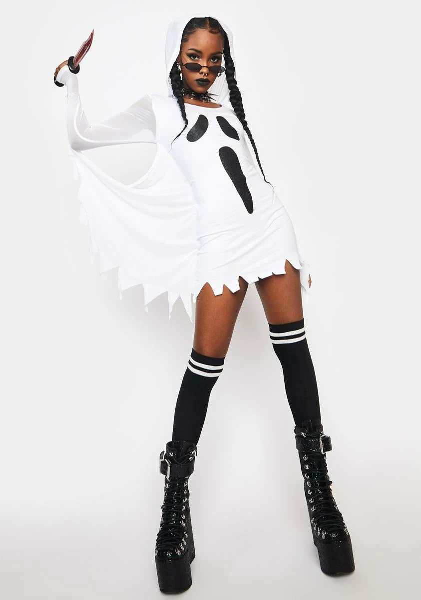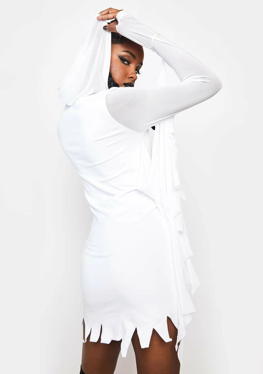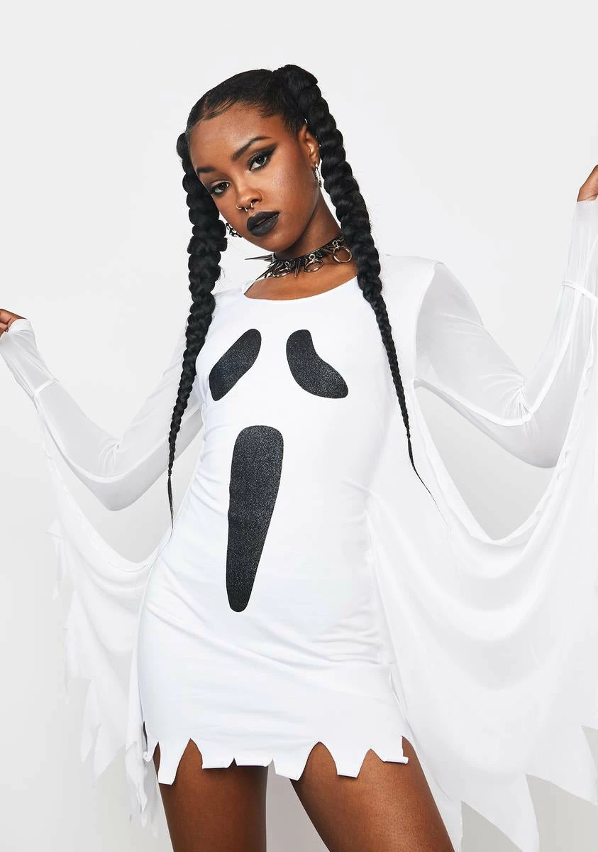 when the sun has gone away, the undead come out to play. This mini dress halloween costume has sheer sleeves with batwing attachments, zig zag hem, and ghost face printed on the front.