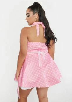 he wants it, he’s got it! You’re here to serve in this retro housewife costume dress that has a polka dot design, a sweetheart neckline with halter straps, a sheer lace apron, a petticoat skirt, and a spatula.