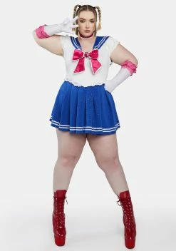 DAMAGED – This product has color transfer damages and is final sale. Color transfer may vary in area. This costume set includes a mini dress with a contrast striped sailor collar and skirt, a bodice with lace trim, satin bow details, and a matching choker and gloves. **FINAL SALE**