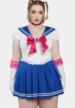 DAMAGED – This product has color transfer damages and is final sale. Color transfer may vary in area. This costume set includes a mini dress with a contrast striped sailor collar and skirt, a bodice with lace trim, satin bow details, and a matching choker and gloves. **FINAL SALE**