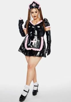 cuz health is wealth! This super cute nurse costume dress has a glossy vinyl construction, contrast pink ruffle and cross trim, and comes with a matching headpiece and toy syringe.