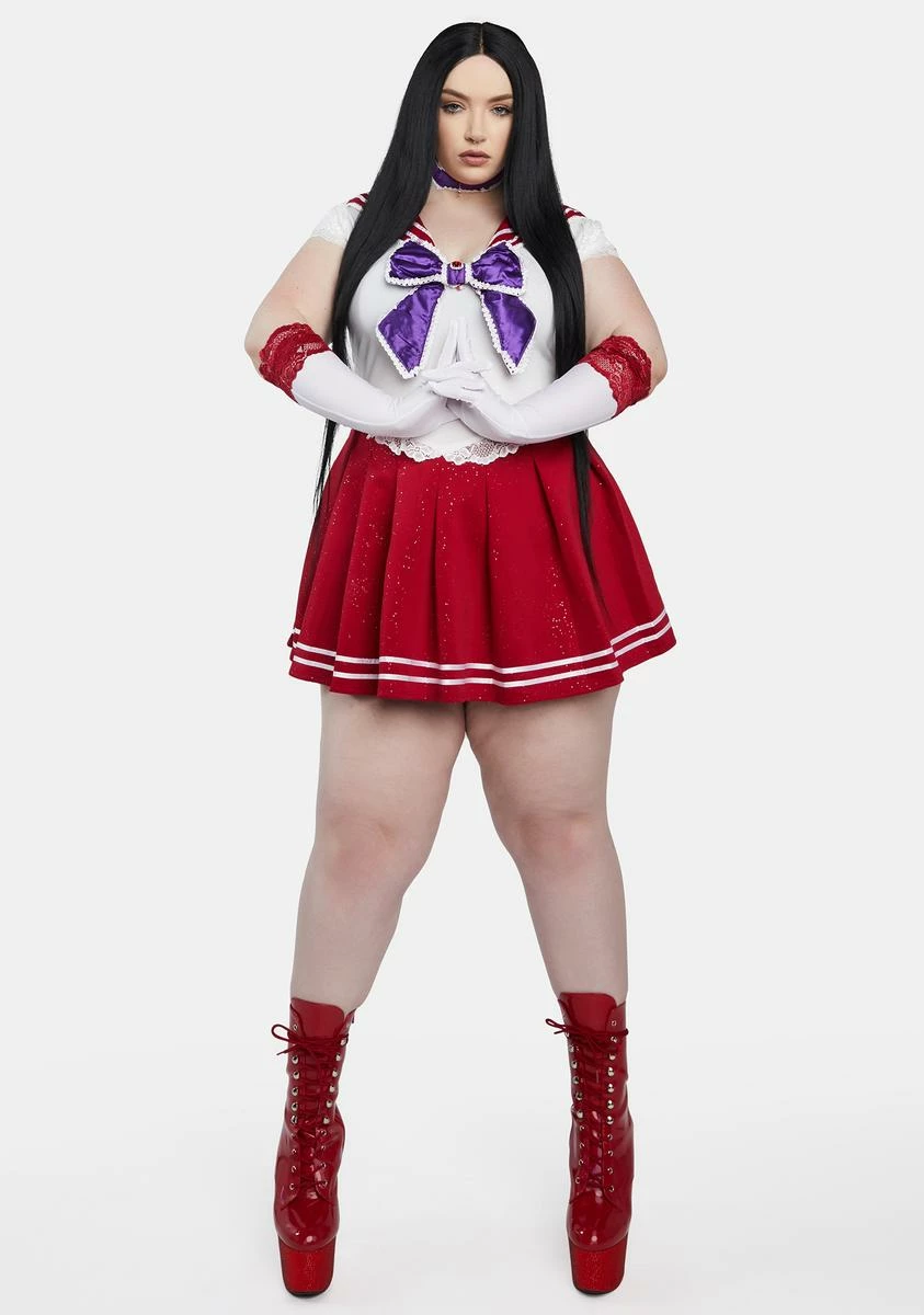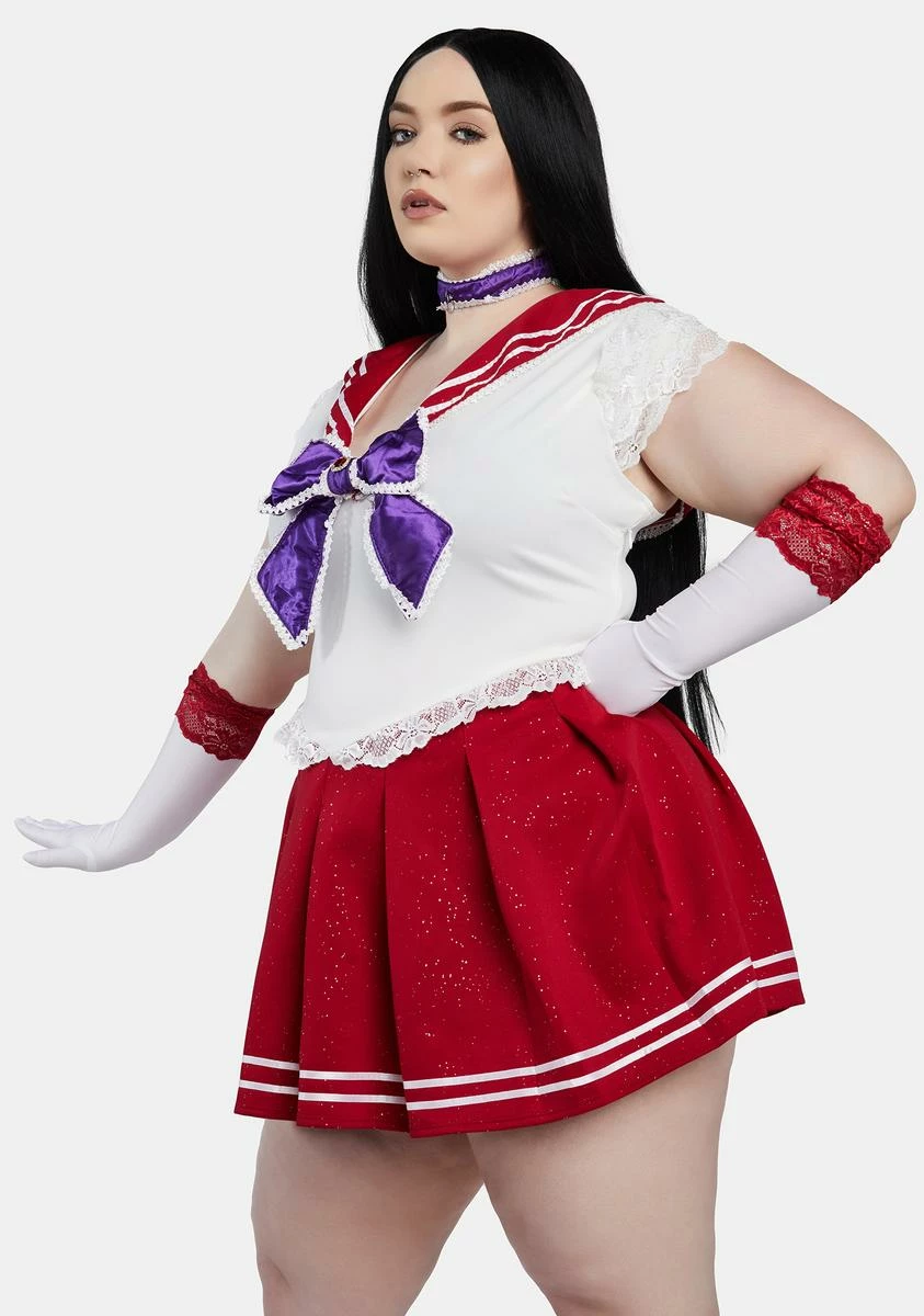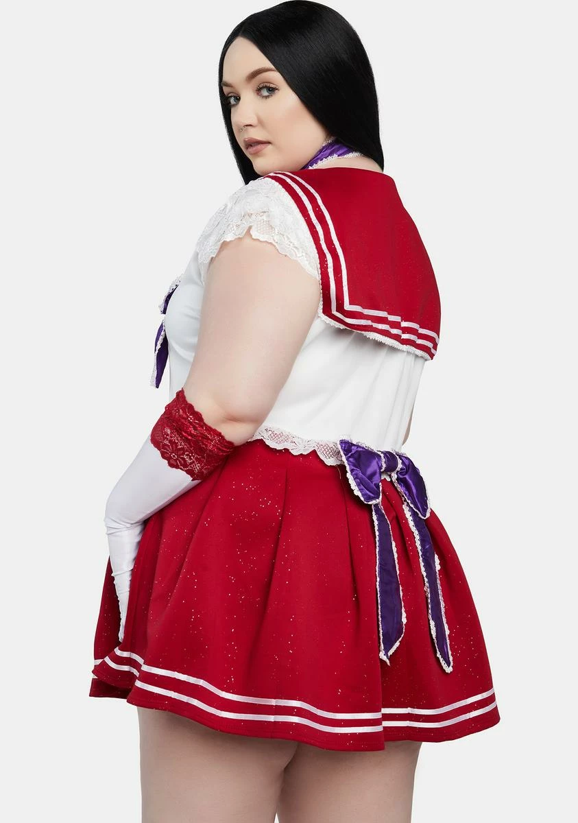 DAMAGED – This product has color transfer damages and is final sale. Color transfer may vary in area. This costume set includes a mini dress with a contrast striped sailor collar and skirt, a bodice with lace trim, satin bow details, and a matching choker and gloves. **FINAL SALE**