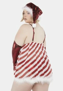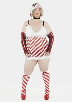 believe in your elf! This holiday-themed costume set has a candy cane-inspired striped print all over, a sheer construction, and fluffy feather trim. Includes a mini dress with adjustable shoulder straps, stockings, and a metallic-finish Santa hat, undies, and arm warmers.