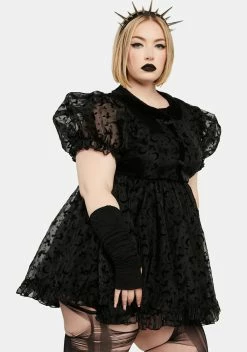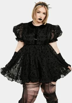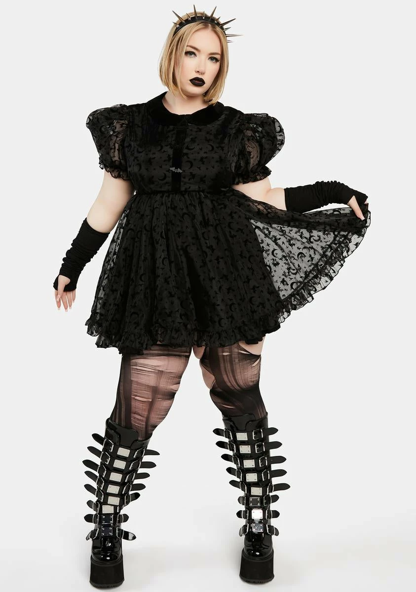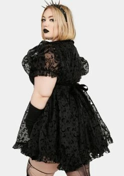 cuz it’s witching hour. This dress comes in a sheer organza construction, with velvet witch and moon details all over, short puff sleeves, ruffle hem details, decorative bat buttons, and a back zip closure.