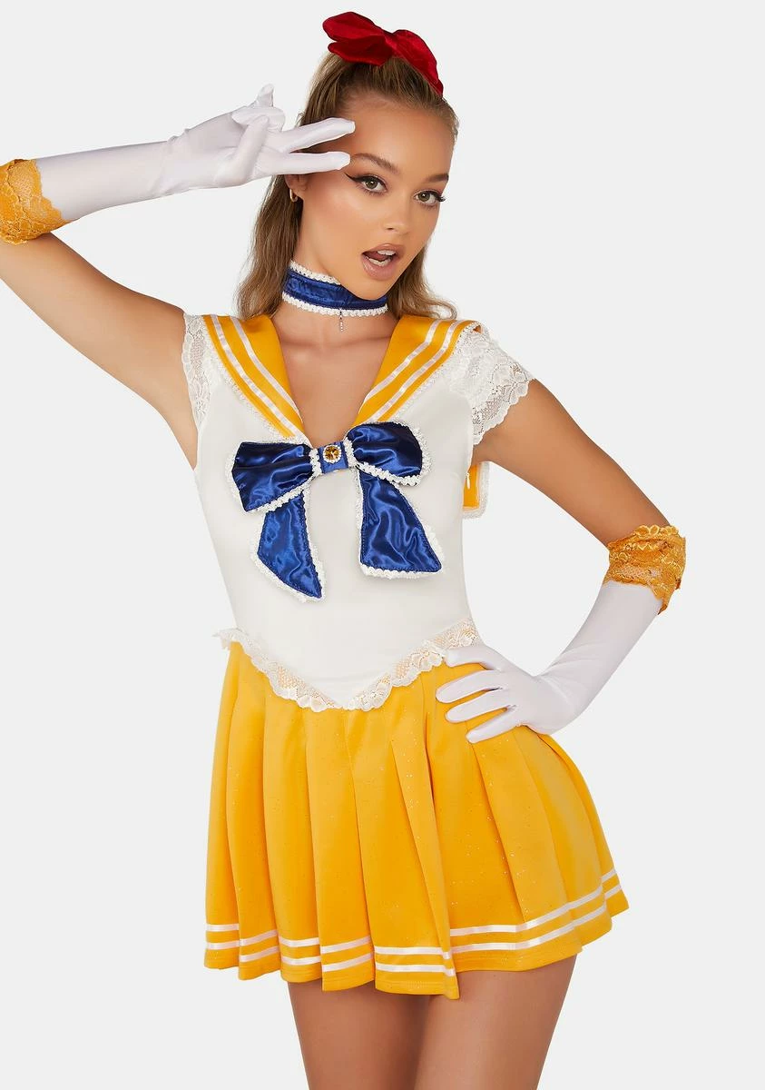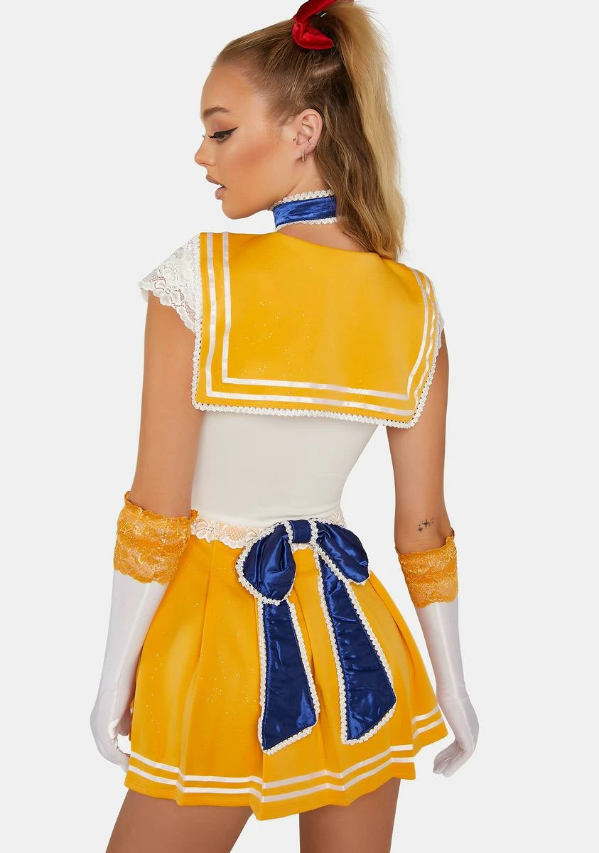 sailors unite! This costume set comes with a mini dress, in a satin crepe construction, with glitter details, lace trim details, front and back bow details, a cape detail, a side zip closure, along with matching mesh gloves, and a satin and lace choker, with a hook and loop closure at back, and a symbol hardware charm.