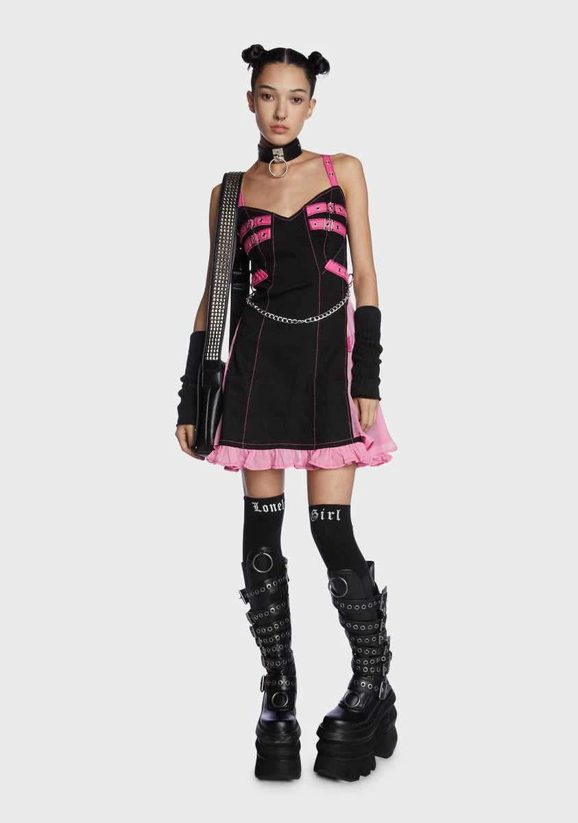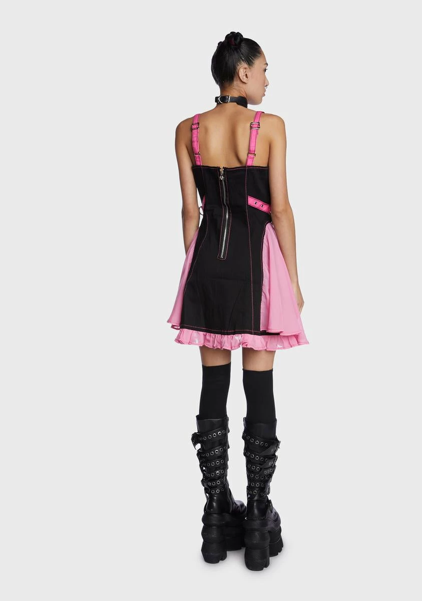 cuz you’re cute but deadly. This pleated mini dress has a stretch twill construction with ruffled chiffon panels, contrast strap detailing with buckle hardware, adjustable shoulder straps, and a back zip closure.