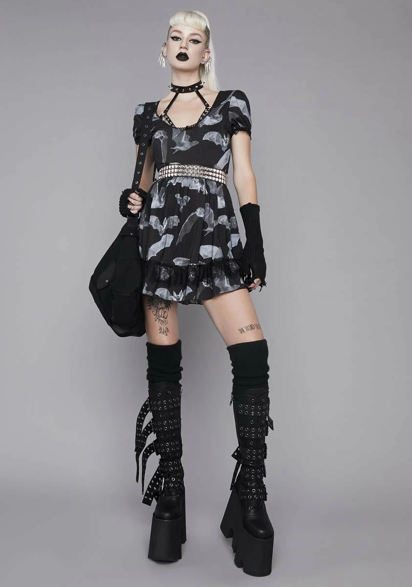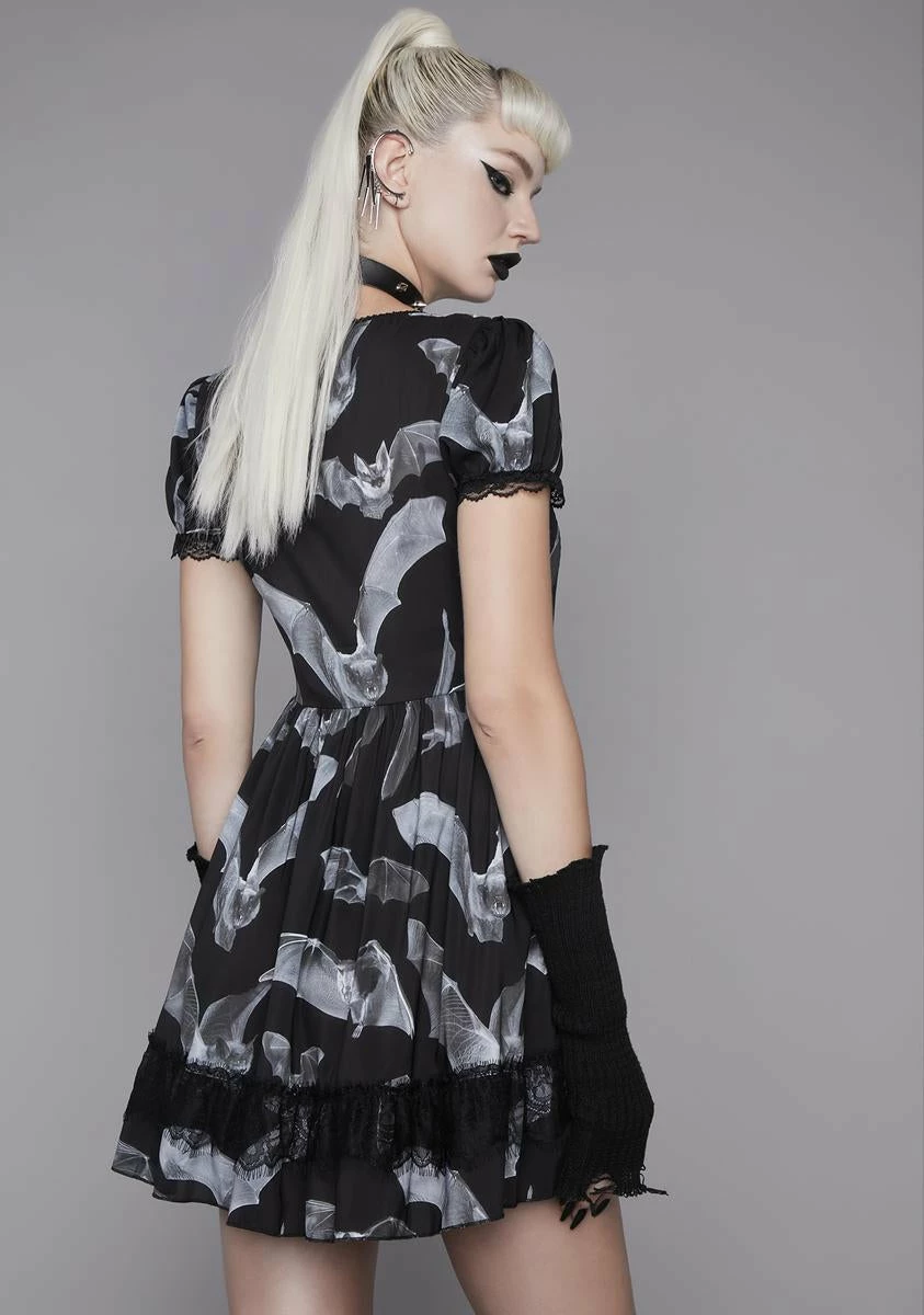 cuz you’re a distant sound. This chiffon babydoll dress has a bat print all over, short puff sleeves, a scoop neckline with tricot trim and a bow detail, and lace trim along the hem.