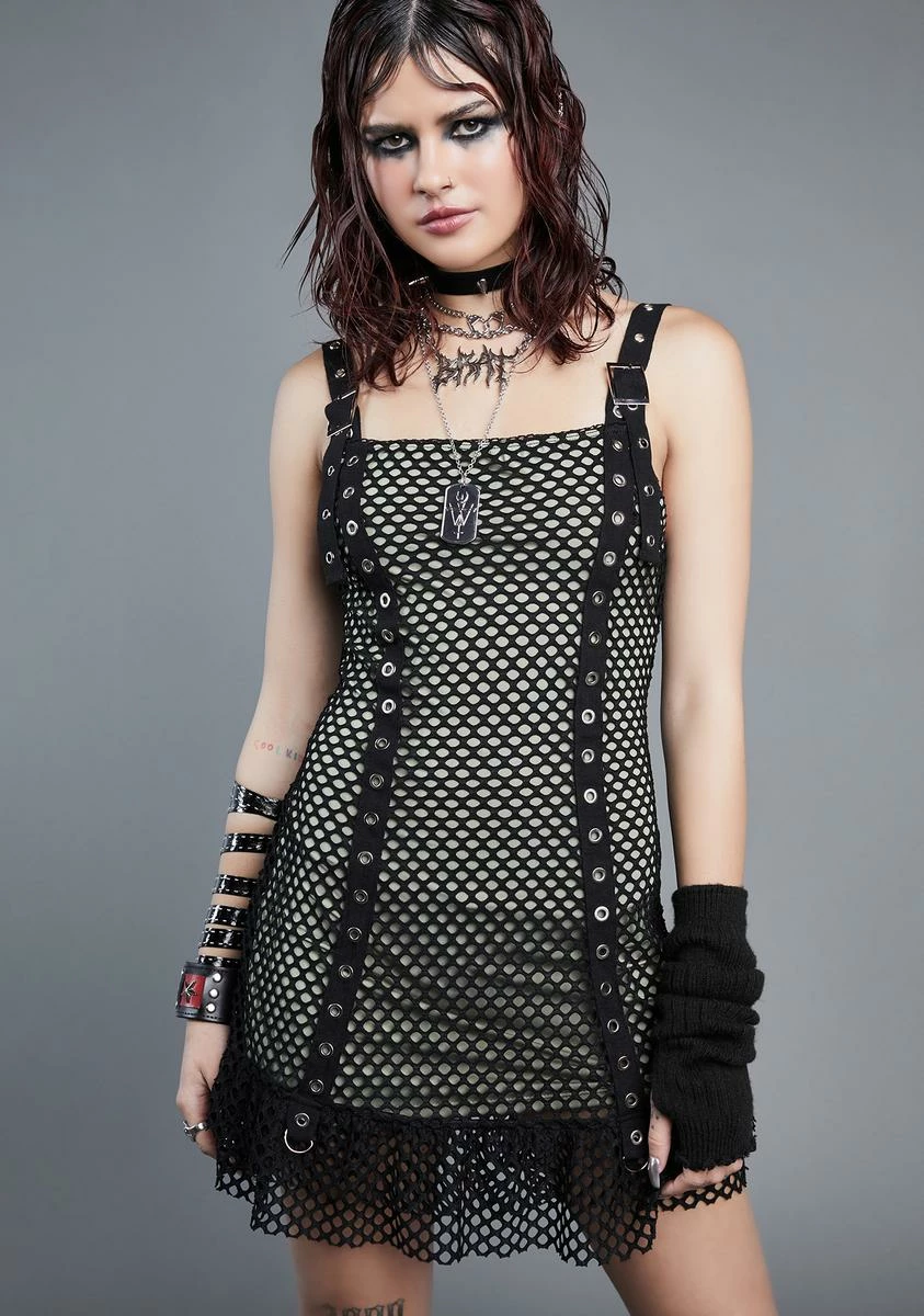 cuz get ready for some kisses! This dress has a stretchy mesh construction, a fishnet overlay, d-ring hardware, grommet detailing, and adjustable buckle shoulder straps.
