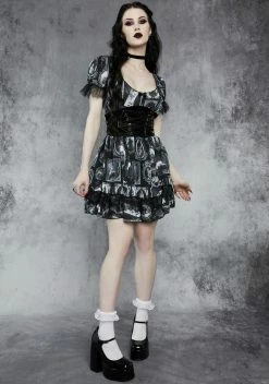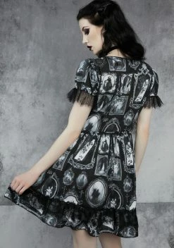 only time will tell… This babydoll dress has short puff sleeves, a scoop neckline with a bow detail on the front, lace trim, and a haunted frame print all over.