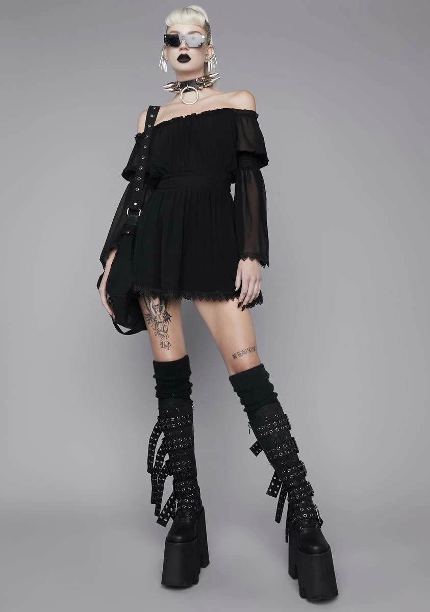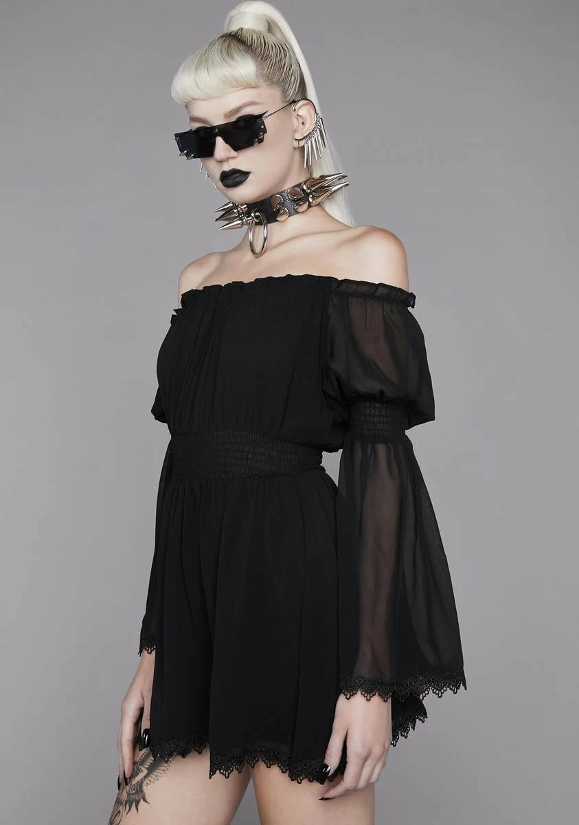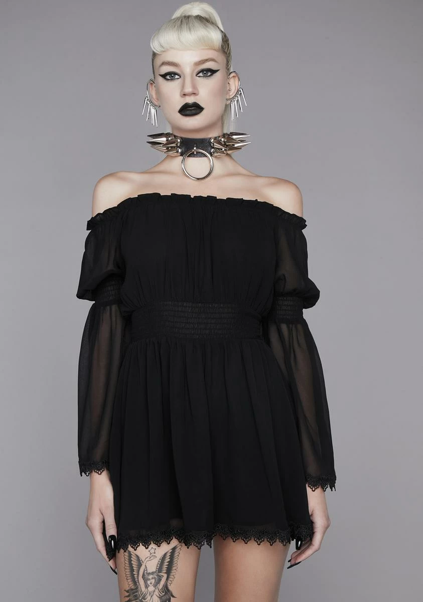 cuz there’s danger around every turn. Take the path less traveled in this vintage-inspired tunic dress with smocked bell sleeves, an off the shoulder neckline, and lace trim.